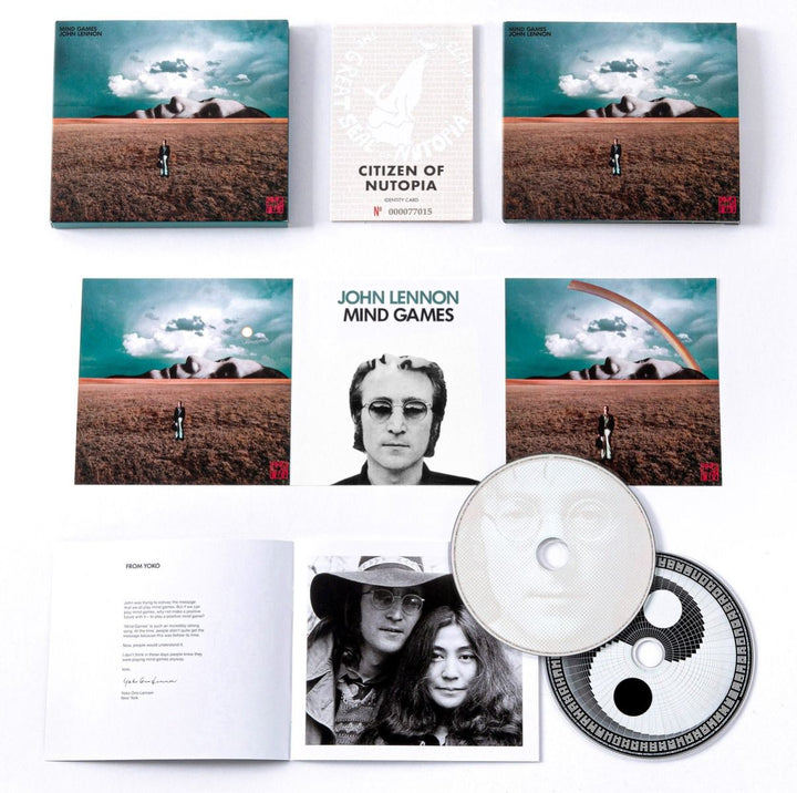 Featuring Mind Games – The Ultimate Mixes and The Out-takes – 24 tracks on 2 CDs; plus a 20-page booklet of photos and artworks; a reproduction of the original 1973 triptych marketing poster and an individually numbered Citizen of Nutopia ID Card.